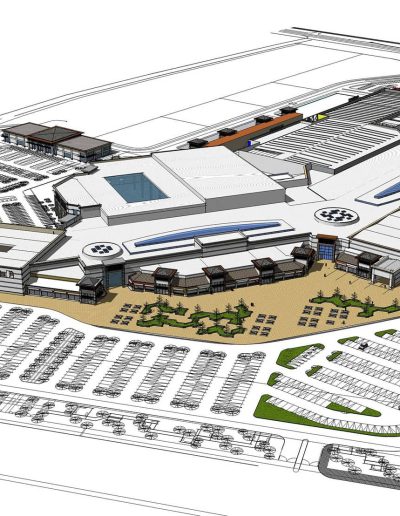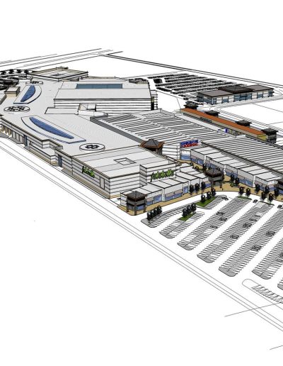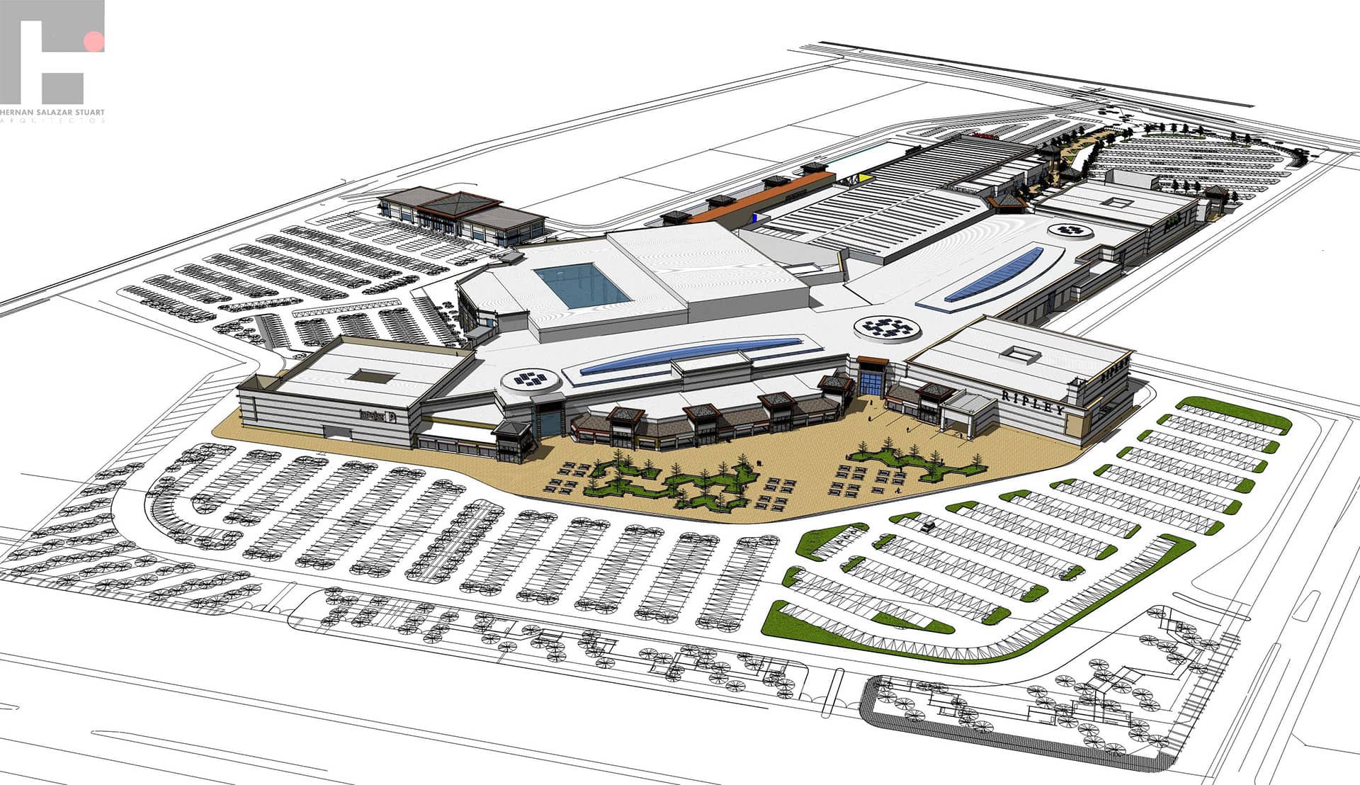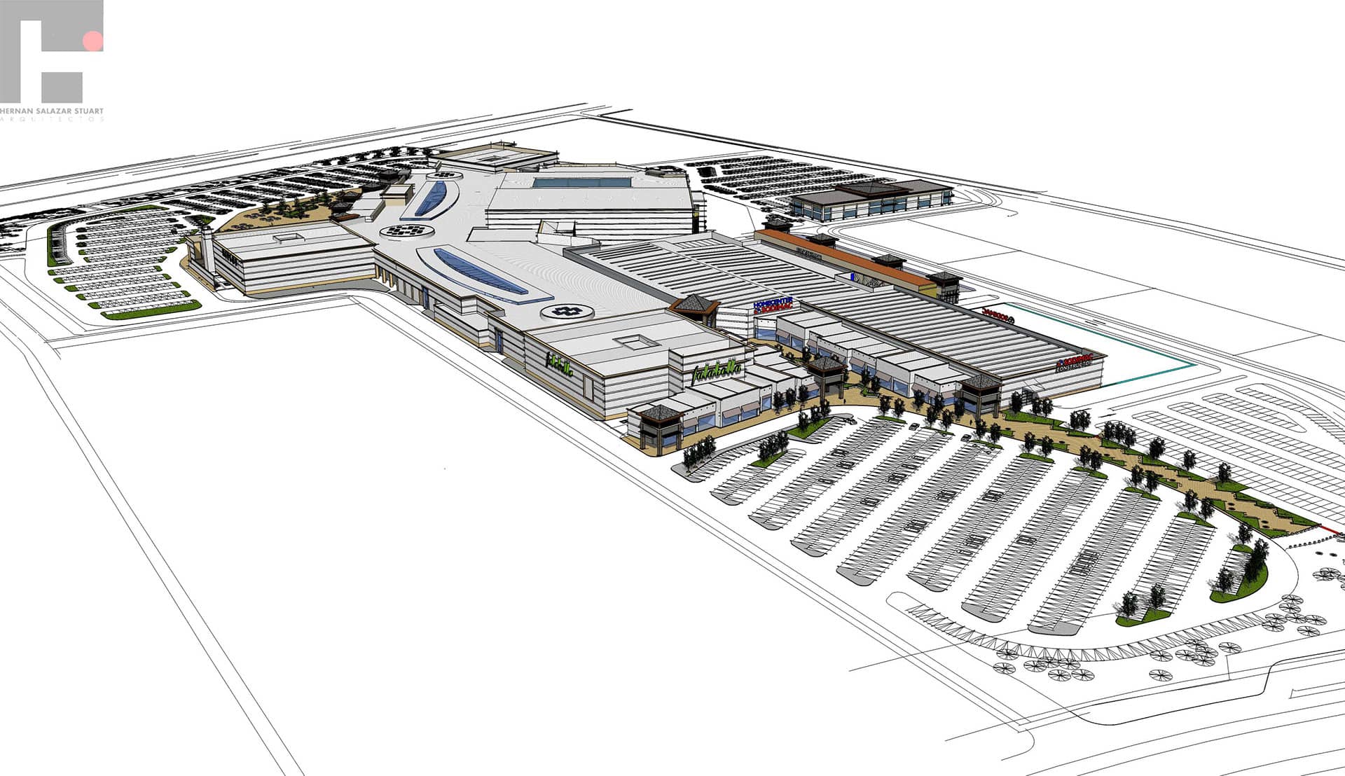 Este es un proyecto de un mall de dos niveles en extensión con un programa muy ambicioso. Junto con tener 3 tiendas intermedias, Homecenter y Supermercado, dispone de dos sectores de servicios, edificio médico y área de restaurante, junto a un gran patio de comida. Como parte esencial de su recorrido es su pasillo central de mas de 200 metros de largo en el cual se dispone toda esta actividad.